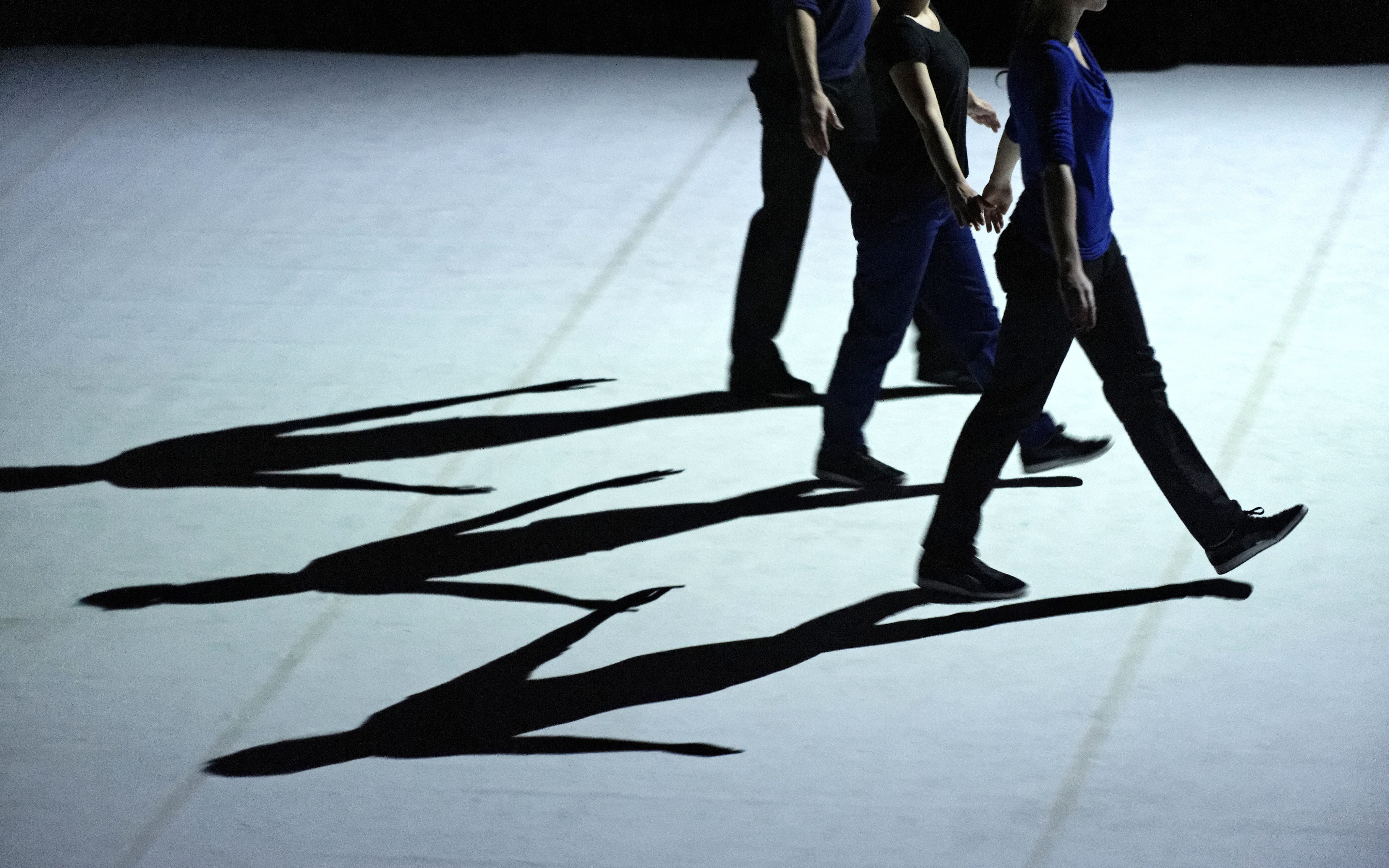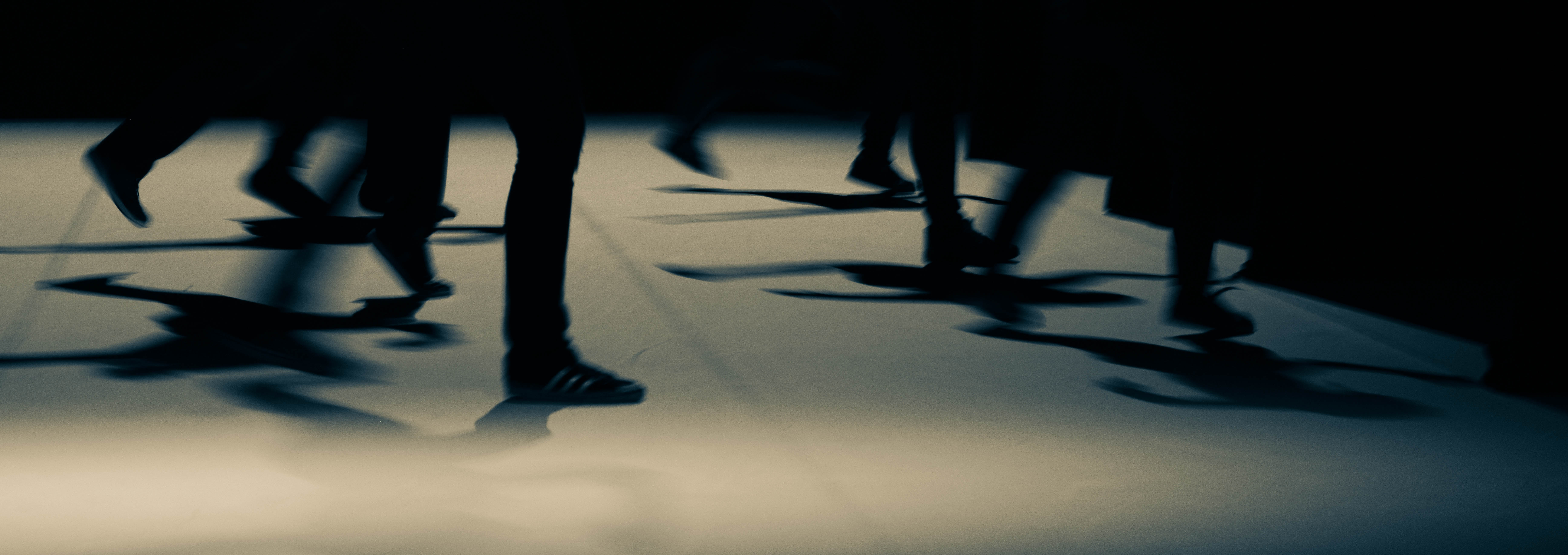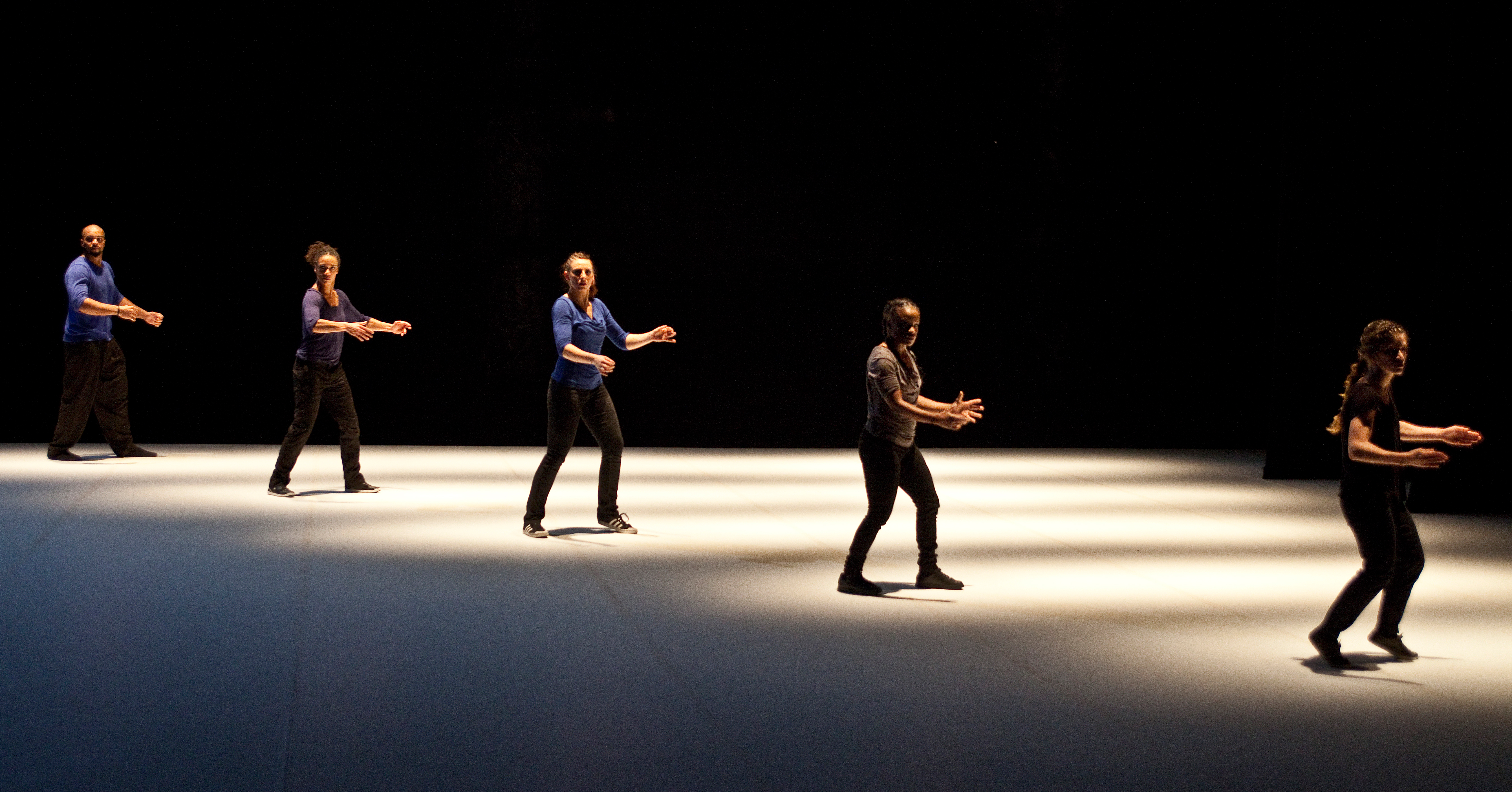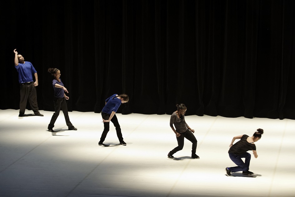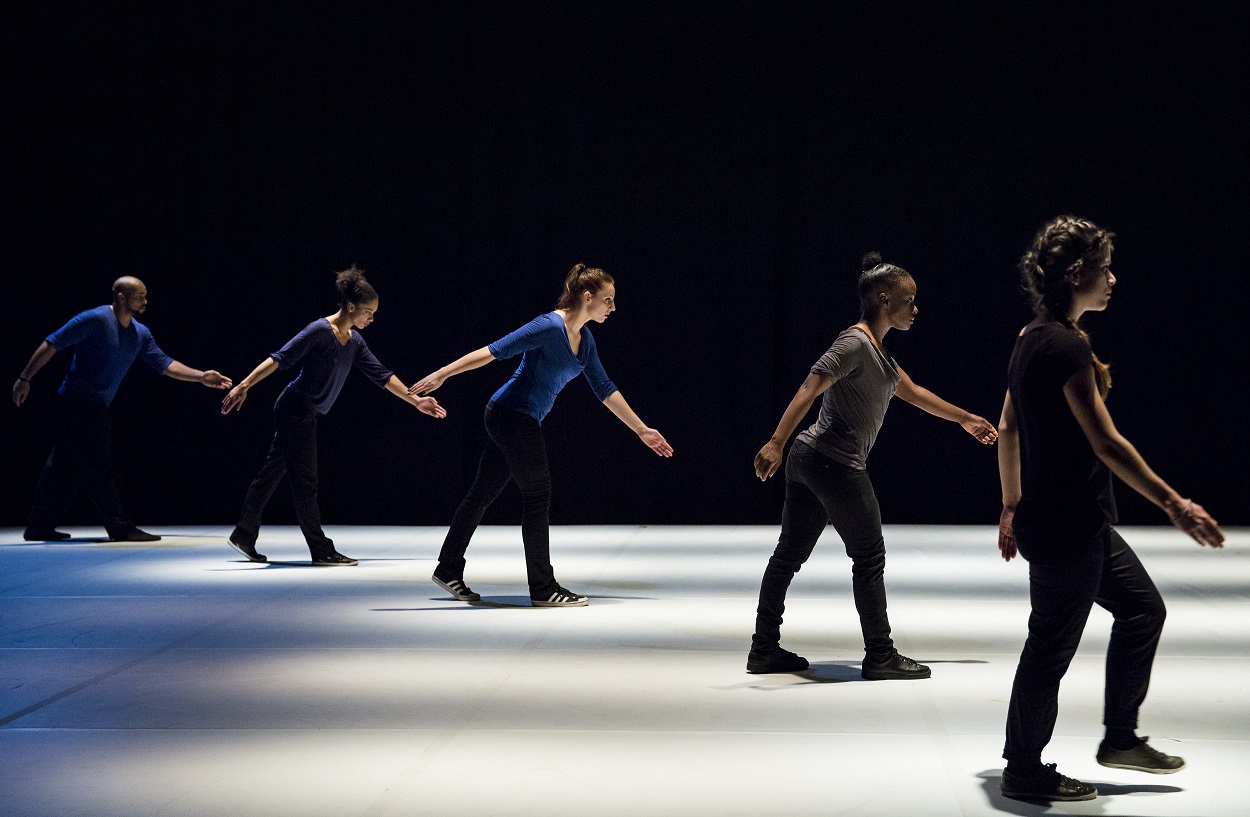 PROMENADE OBLIGATOIRE is a non-stop on-stage journey along a timeline for eight popping specialists, an explosive hip-hop dance style based on blocked, isolated, dislocated muscle movements. From compact mass to molecular chains, from ideally ordered formations resembling military parades to differentiation, the dancers proceed through a succession of evanescent states. Together they comprise a moving matter endowed with a collective memory, their past evolutions re-emerging cyclically, confronting oblivion, instinct and the desire of creation. Along this living timeline, in which the individual struggles alternately against a deterministic path and his own imprisonment, the hip-hop dance is broken down and transposed into a lateral movement that becomes enchanting. Played out against an electronic musical score with industrial overtones, PROMENADE OBLIGATOIRE examines the various possible states of “togetherness” in an ever-changing society.