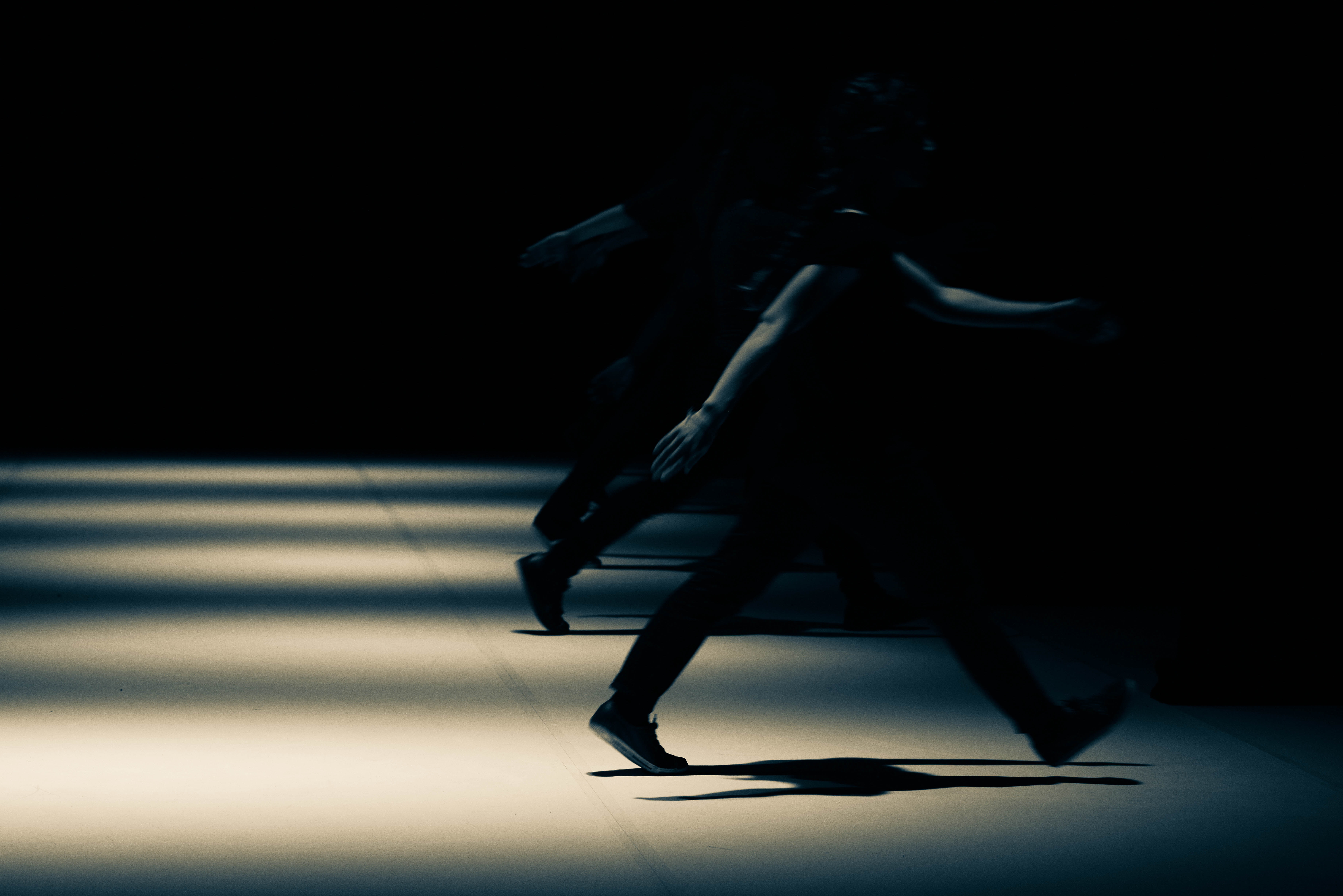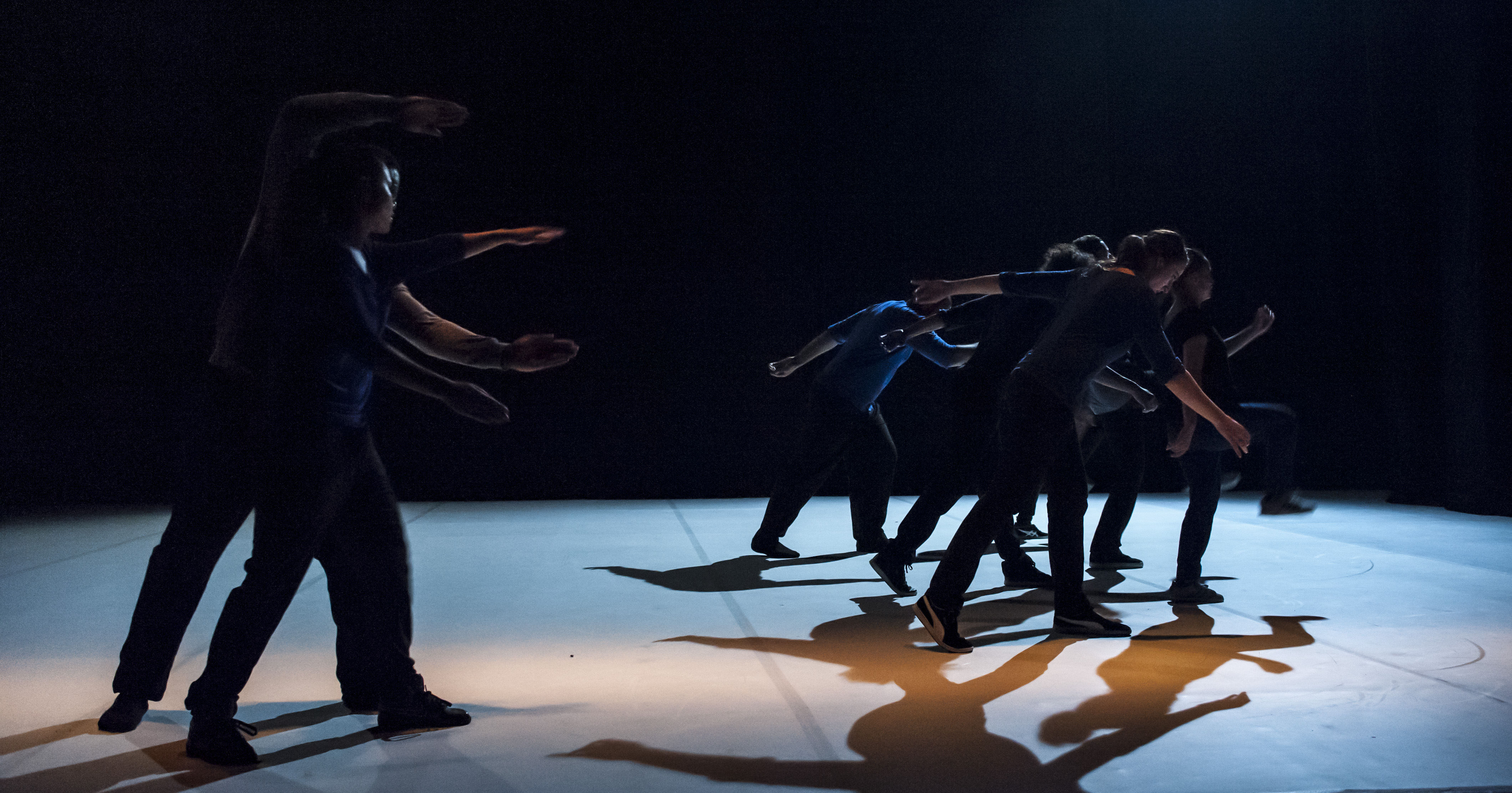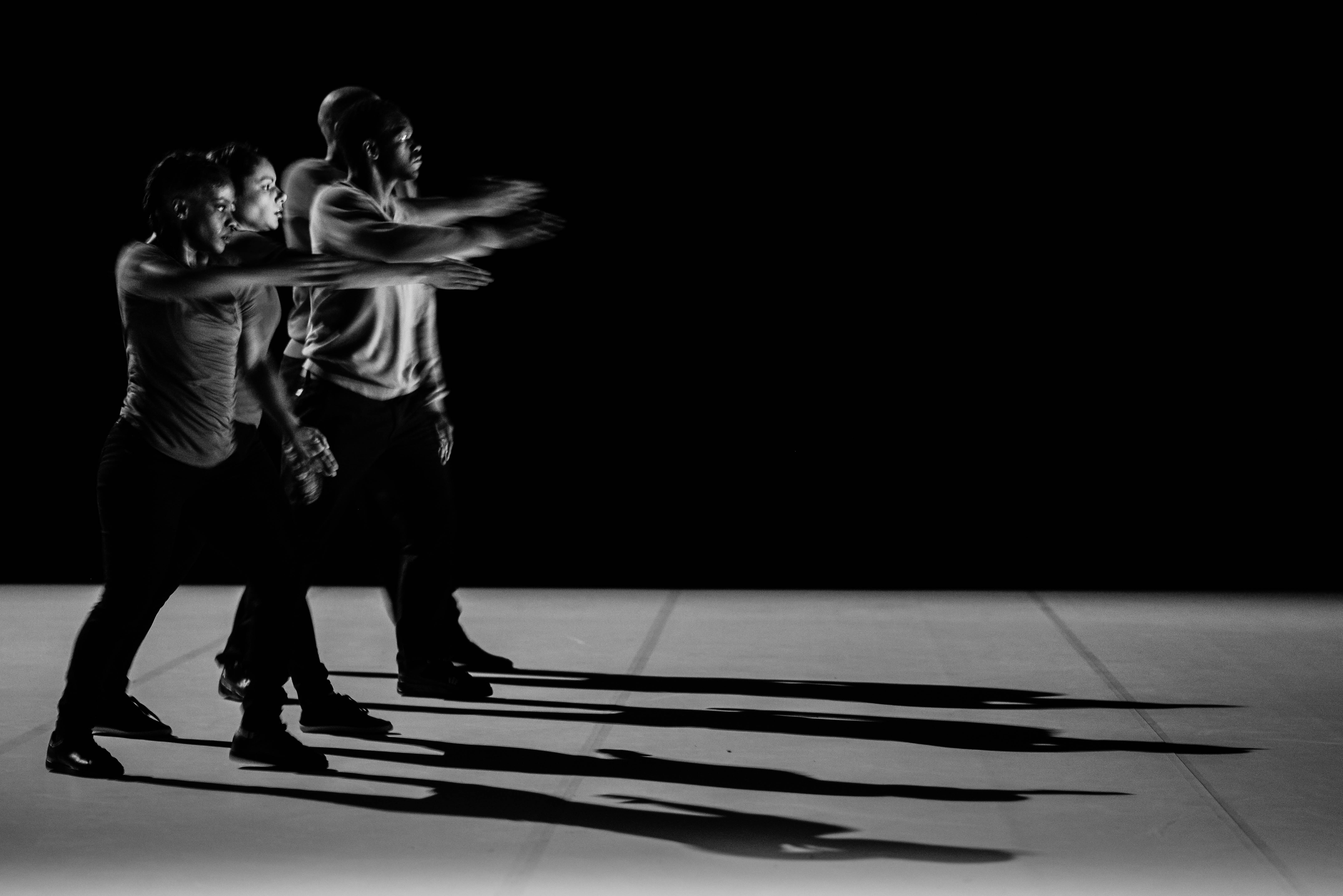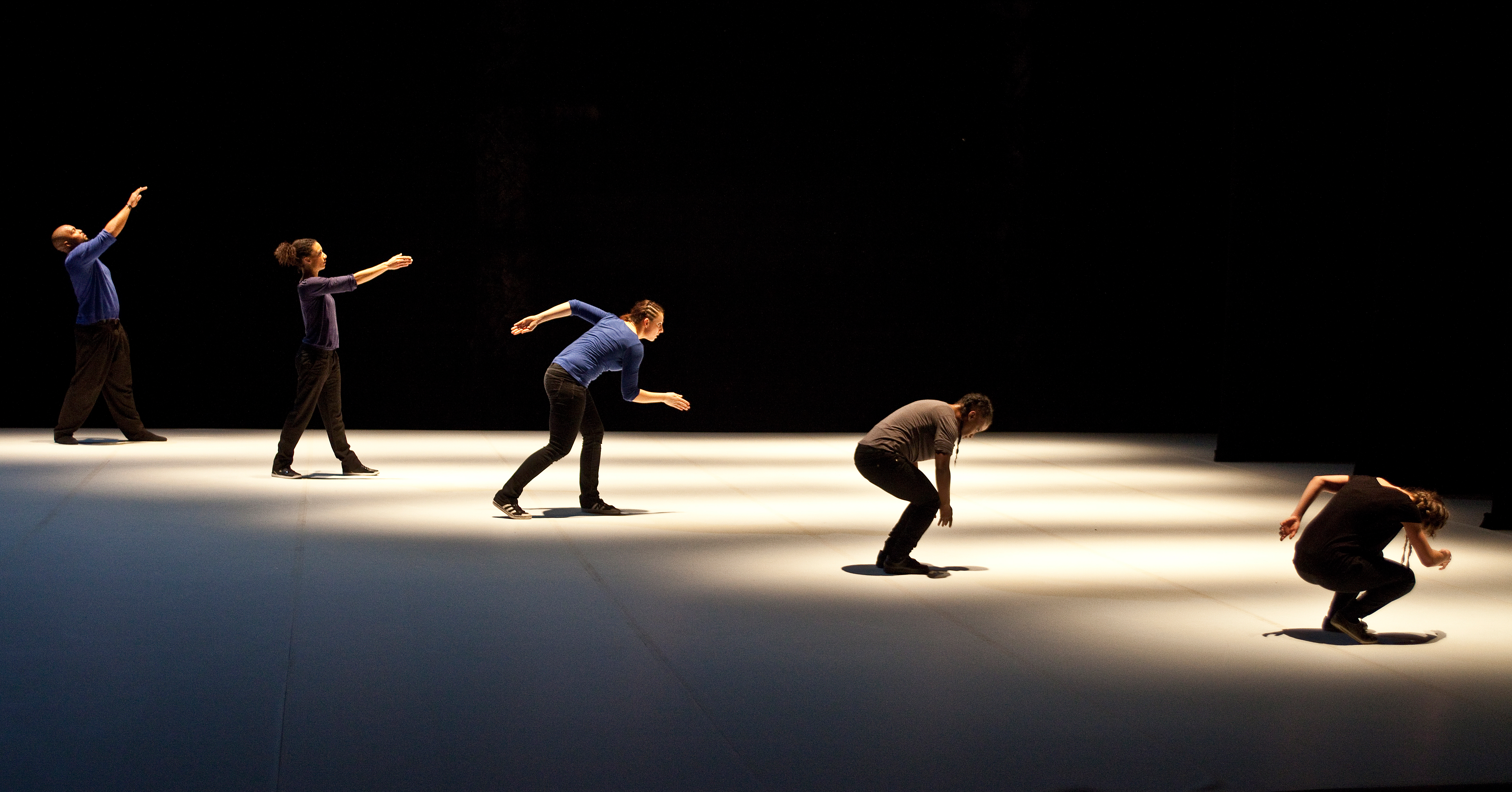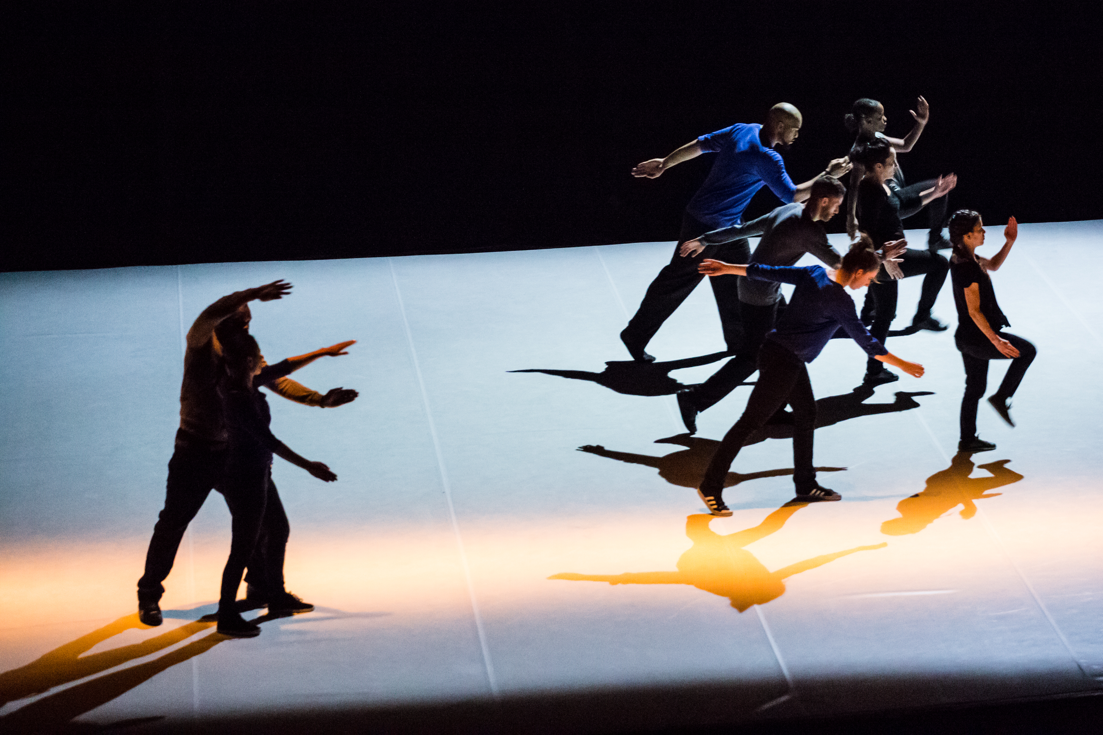 PROMENADE OBLIGATOIRE is a non-stop on-stage journey along a timeline for eight popping specialists, an explosive hip-hop dance style based on blocked, isolated, dislocated muscle movements. From compact mass to molecular chains, from ideally ordered formations resembling military parades to differentiation, the dancers proceed through a succession of evanescent states. Together they comprise a moving matter endowed with a collective memory, their past evolutions re-emerging cyclically, confronting oblivion, instinct and the desire of creation. Along this living timeline, in which the individual struggles alternately against a deterministic path and his own imprisonment, the hip-hop dance is broken down and transposed into a lateral movement that becomes enchanting. Played out against an electronic musical score with industrial overtones, PROMENADE OBLIGATOIRE examines the various possible states of “togetherness” in an ever-changing society.