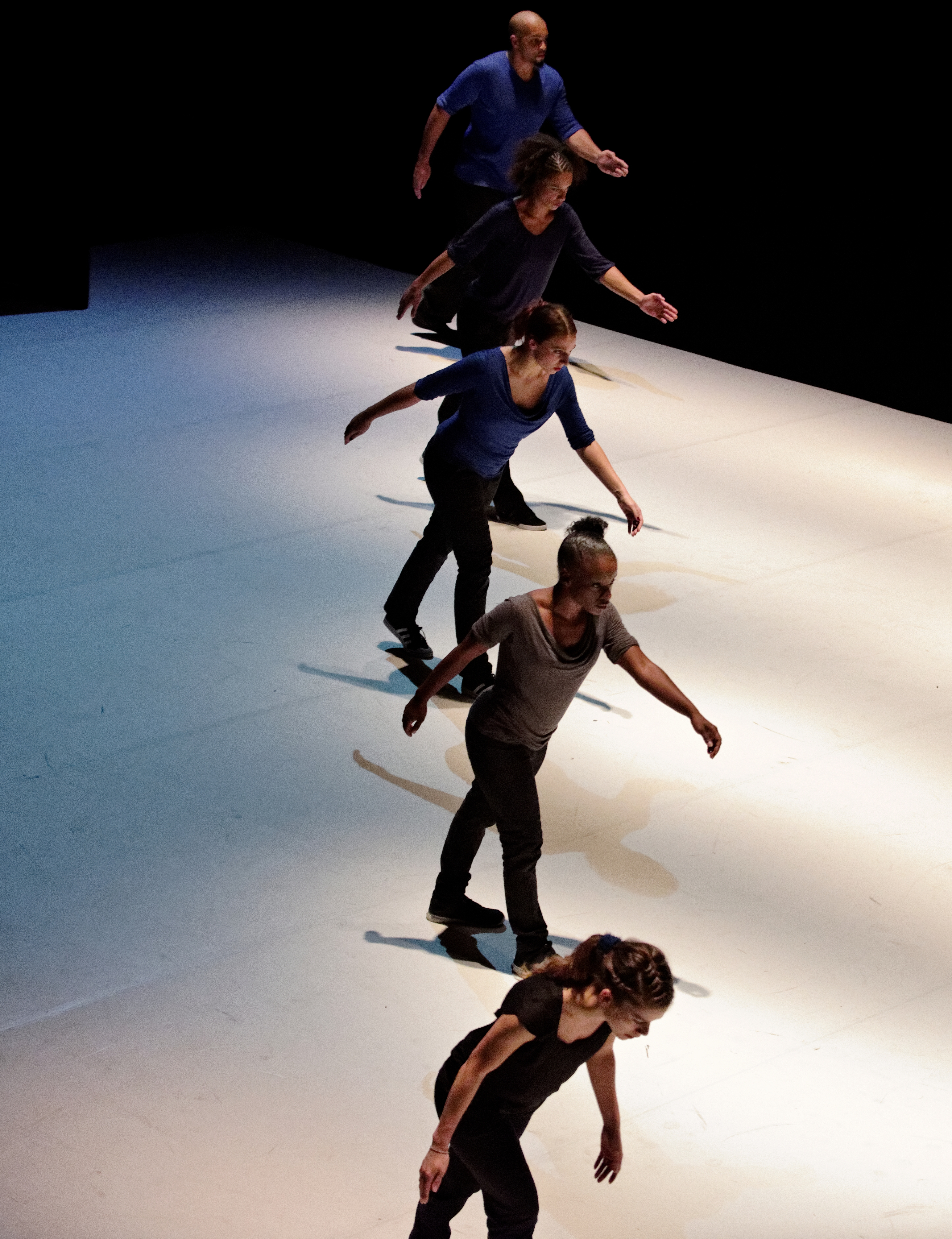 […] The dancers symbolize changes of life, obstacles, traps, happiness and tiredness through movements–the shiver of a hand, a foot looking for somewhere to hang on to or perfect synchronizations–thus managing to pass on the greatest feelings. This piece of great density creates a world of its own. Like being sucked into a black hole, the spectator is fully immersed in PROMENADE OBLIGATOIRE. One quickly understands that what is dealt with is much deeper than daily life topics. Nguyen says to be inspired by physics and the spirit of her explorations is revealed on stage: looking for the role of Man in his environment… Alchemy and sensations are one and the same in this full circle.”