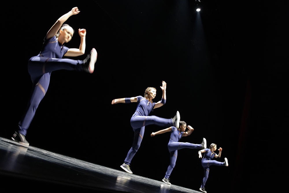 Autarcie (….) is a game of strategy where, for 50 minutes, four dancers engage in a frantic ritual, alternating between forward-facing dance moves and free digression. The four women transform their respective dance specialities of breakdance, popping and waacking into an abstract vocabulary, establishing their powerful individualities on stage and thrusting themselves into the space in pursuit of territory, alliances and hierarchy. The front of the stage is the rallying point where the dancers come together and devise a warrior dance directed at the audience. The inner workings of this restless “tribe” with all the power struggles that ensue and the search for possible points of harmony, thus unfold on stage, to the pulsating, unbridled rhythms of the percussive organic beat.