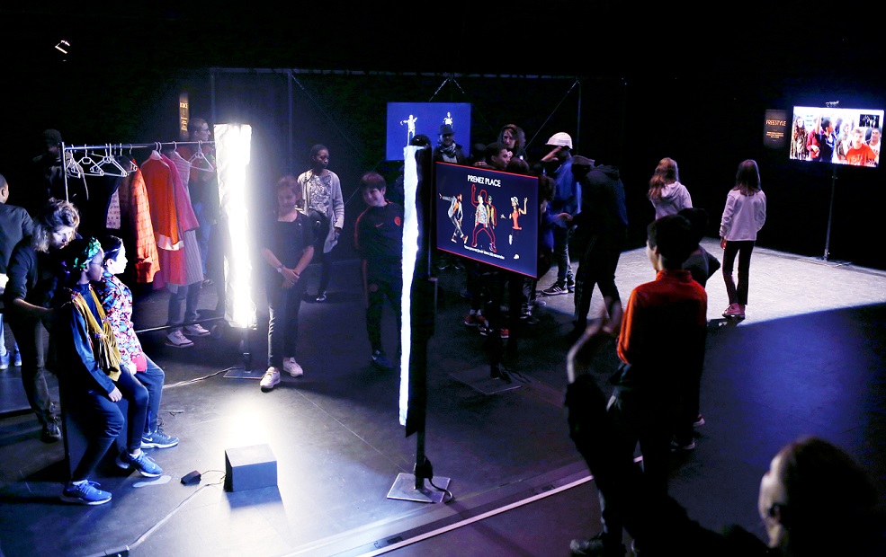 Dance of the city warriors is an immersive, participatory course of interactive installations centered on hip-hop dance. Guided from within the urban arena by a frieze of dancing figures, the spectator enters an intimate space and explores a series of interactive installations exploiting various video techniques such as live image capturing and animation, interactive editing, and virtual reality with – among other things – a 360-degree film, a virtual staging and devices to transform the spectator’s image… Tuts, bounce, battle, freestyle, jam, each installation is named after elements of hip-hop dance, which the audience is invited to experiment with, either by interacting with the video images and sounds they see and hear, or by playing around with their own image. The spectator is placed at the centre of this sensory experience. He can thus fully identify with the array of sensations impacting upon the hip-hop dancer and is prompted to adopt strange positions and improvise with his own dance movements. His image is captured, reworked and a link is forged with the human frieze guiding the audience, a process that allows him to enter into the virtual human network of city warriors.